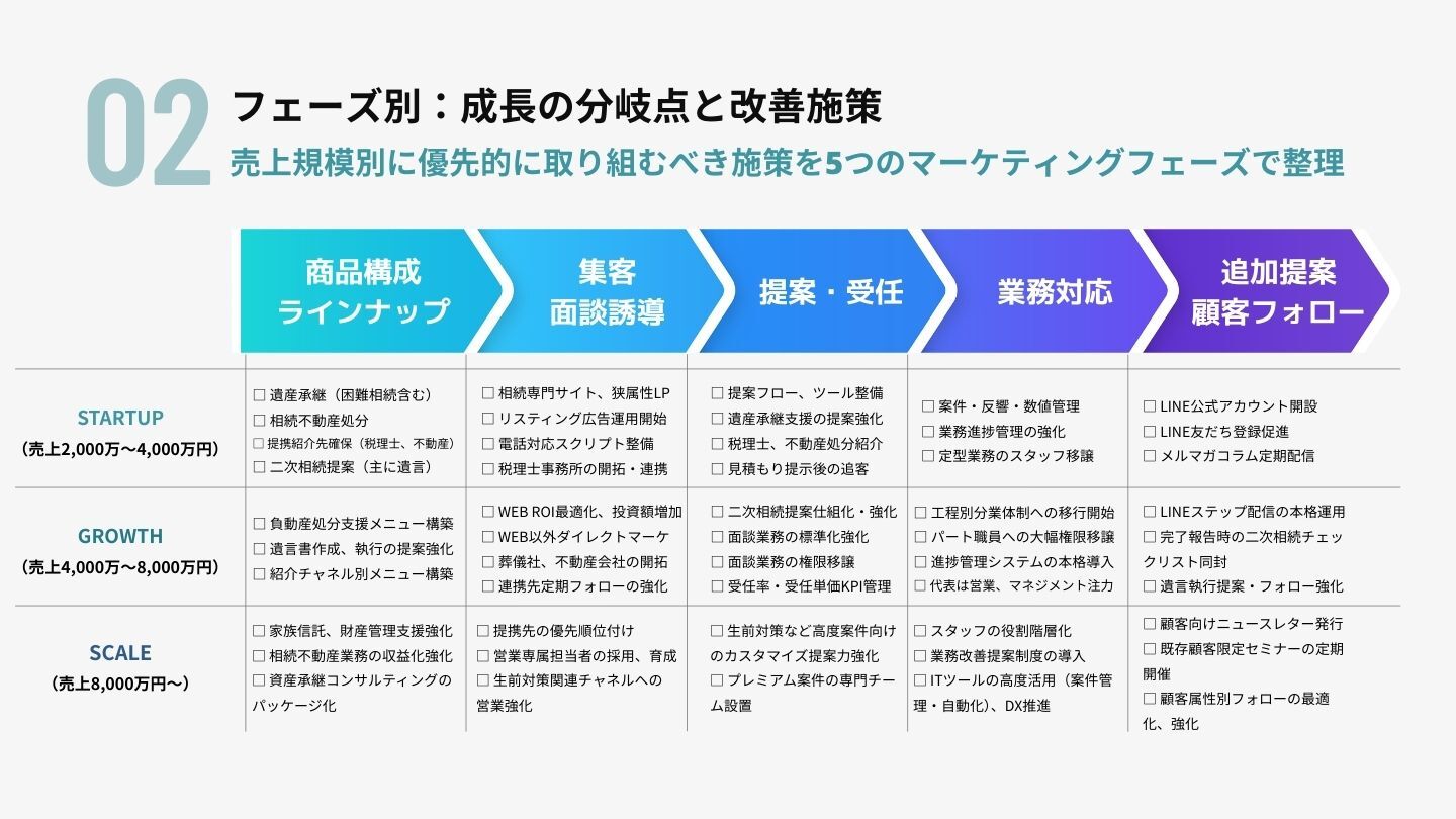 STARTUP(〜4,000万円)/ GROWTH(4,000〜8,000万円)/ SCALE(8,000万円〜)の3フェーズで、商品構成・集客・提案受任・業務対応・追加提案の優先施策をまとめたロードマップ
